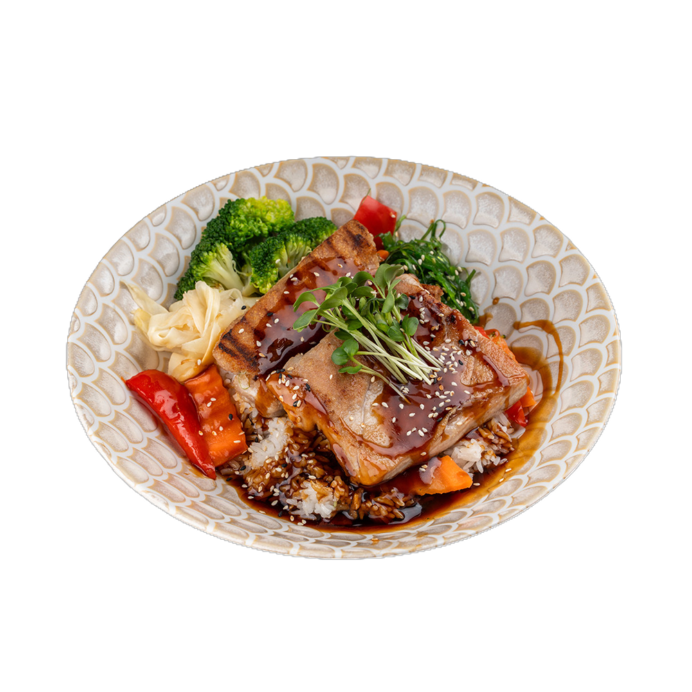 tuna filet, broccoli, ginger, wakame salad, teriyaki sauce, sushi rice