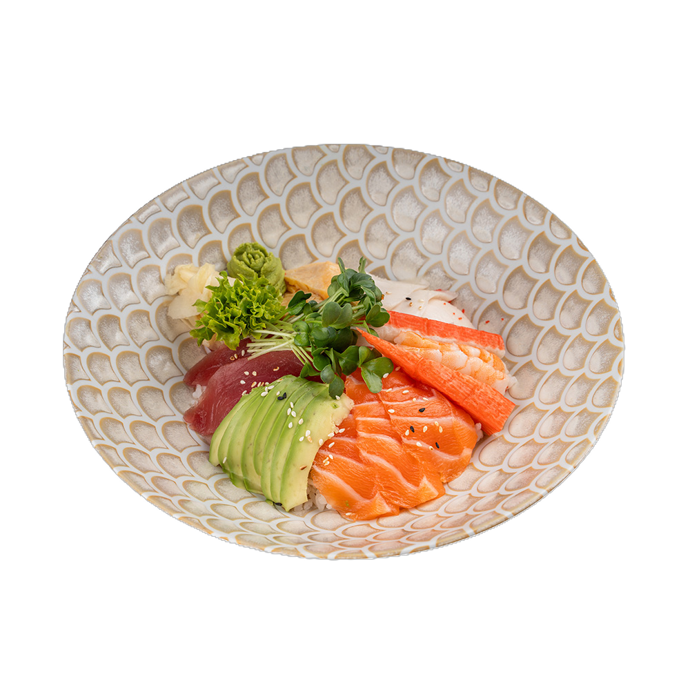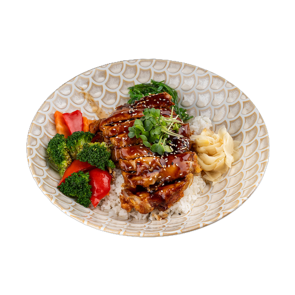 crispy chicken, wakame salad, ginger, broccoli, teriyaki sauce, sushi rice